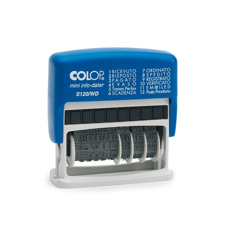 Timbro mini datario S120/WD polinomio autoinchiostrante. 12 diciture: RICEVUTO, RISPOSTO, PAGATO, FATTURATO, Trasm. Per fax, SCADENZA, ORDINATO, SPEDITO, REGISTRATO, VERIFICATO, EM@ILED, APPROVATO. Altezza caratteri 4mm. Tampone di ricambio E/12/2 (cod 48019).