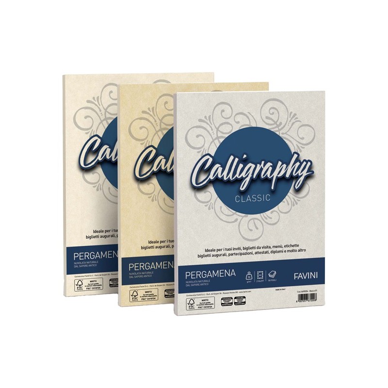 Carta da 90gr nelle morbide tonalità della pergamena riproposte dalla carta Laguna Favini. Utilizzabili per scrittura manuale, inkjet, laser e copy. Formato 21x29,7cm.