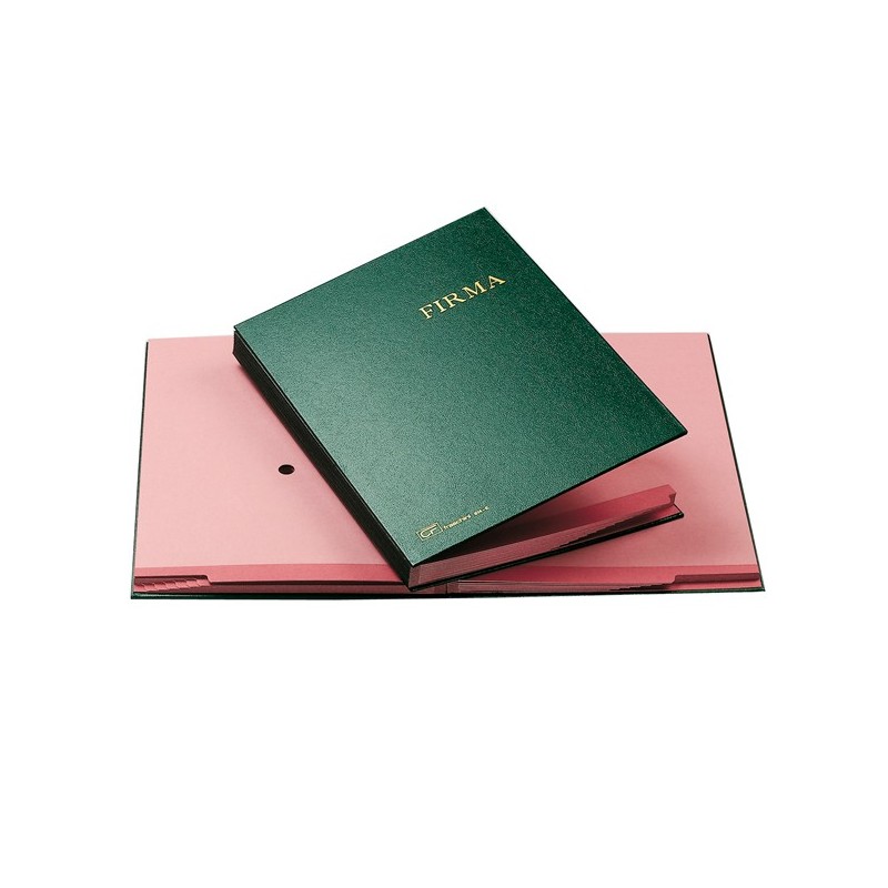 Libri firma in robusta copertina in cartone rivestita in dermoide. 14 intercalari rinforzati in resistente cartoncino assorbente accoppiato. Dorso a soffietto rinforzato in imitlin. Formato utile 24x34cm.
