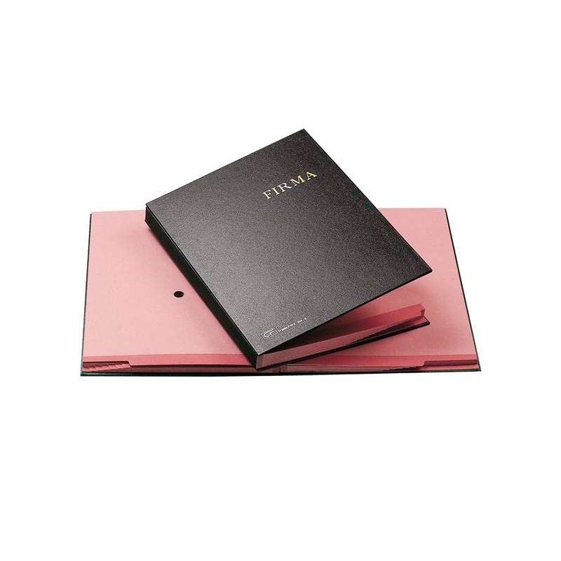 Libri firma in robusta copertina in cartone rivestita in dermoide. 14 intercalari rinforzati in resistente cartoncino assorbente accoppiato. Dorso a soffietto rinforzato in imitlin. Formato utile 24x34cm.