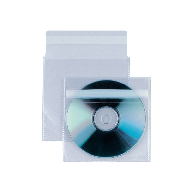 Buste porta CD-DVD in PP liscio con patella autoadesiva di chiusura per evitare la fuoriuscita accidentale di un CD-DVD. Formato 12.5x12cm. Confezione da 25 buste.