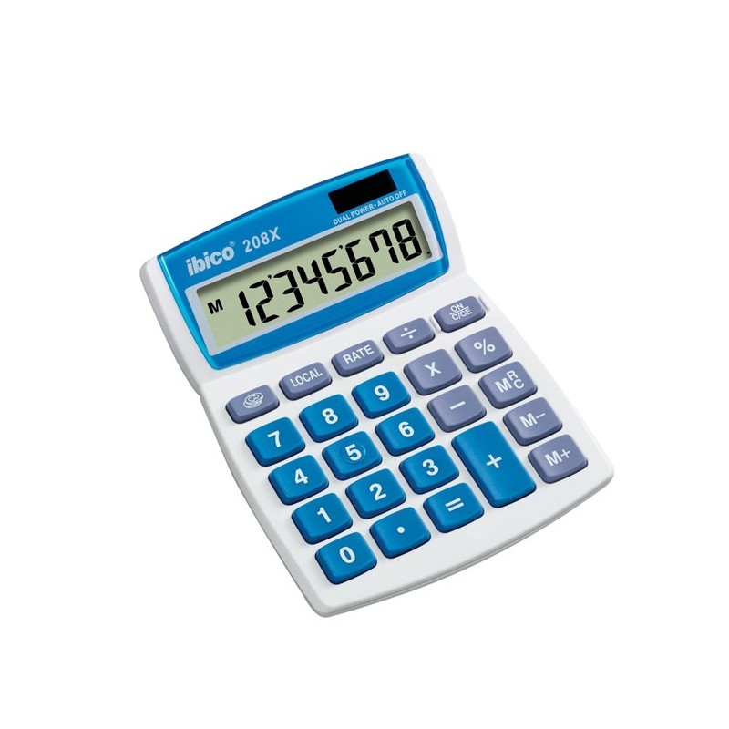 Display 8 cifre. Conversione valuta. 3 tasti memorie. Funzione %. Dimensioni: 50x106x136mm. Alimentazione solare/batterie.