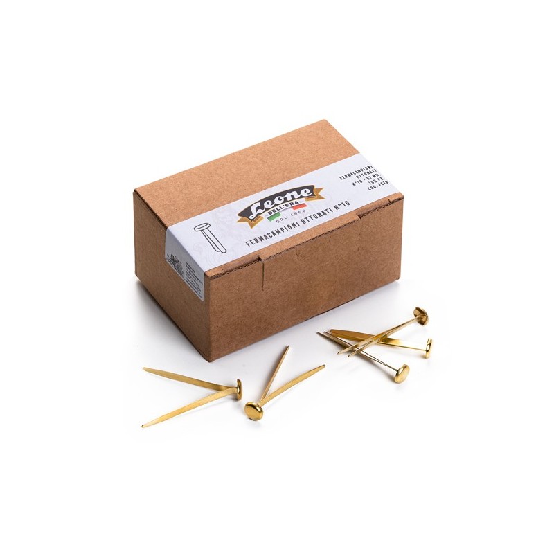 Fermacampioni ottonati. Perfetti nella forma, con una grande testa grazie a una tranciatura e piegatura di precisione. Brillanti e antiruggine grazie a una accurata ottonatura elettrolitica. Confezione da 10 scatole.