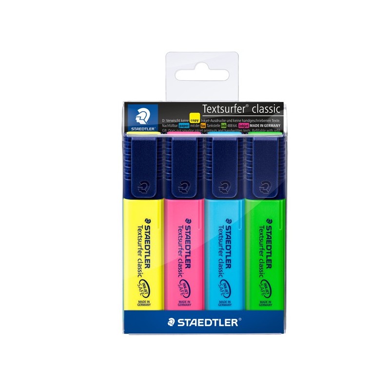 Busta 4 colori (giallo, fucsia, azzurro, verde). Evidenziatore TEXTSURFER CLASSIC. Inchiostro pigmentato lunga durata. Sistema INKJET SAFE. Asciugatura rapida. Cappuccio girevole per facile apertura dotato di clip. Ideale per carta, fax e copy. Punta scalpello.
