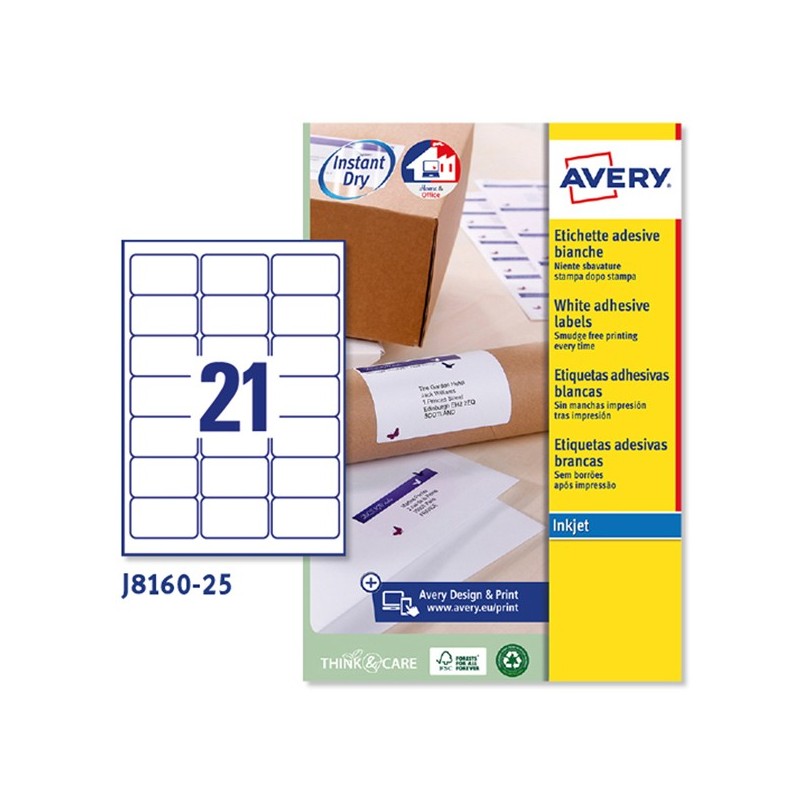 Confezione da 25 fogli in formato A4 in carta adesiva bianca. Ogni foglio contiene 21 etichette rettangolari con angoli tondi nel formato 63,5 x 38,1 mm. Adatto per stampanti inkjet. Tecnologia QuickDry.