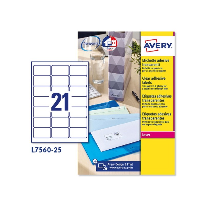 Scatola da 25 fogli in formato A4 in poliestere trasparente adesivo. Etichette rettangolari per stampanti laser e laser a colori. Tecnologia QuickPEEL™