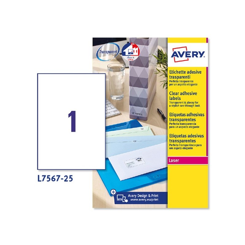 Scatola da 25 fogli nel formato A4 di poliestere trasparente adesivo permanente. Etichette rettangolari. Adatta a stampanti laser e laser colori. Tecnologia QuickPEEL™