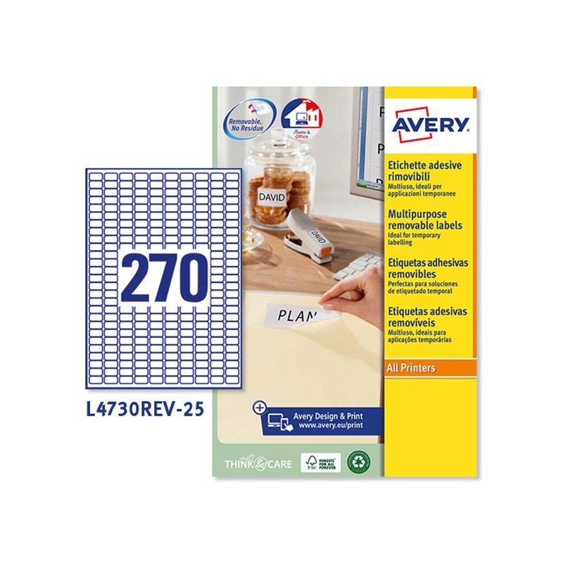 Confezione da 25 fogli nel formato A4 in carta bianca con adesivo rimovibile. Ogni foglio contiene 270 etichette con angoli tondi nel formato 17,8x10mm. Per stampanti Inkjet, Laser, Laser a colori. L'etichetta aderisce su diversi tipi di superfici rimovibile senza lasciare residui. Può essere riposizionata diverse volte su superfici quali vetro, metallo e plastica. Ecologiche, possono essere riciclate come la carta comune.