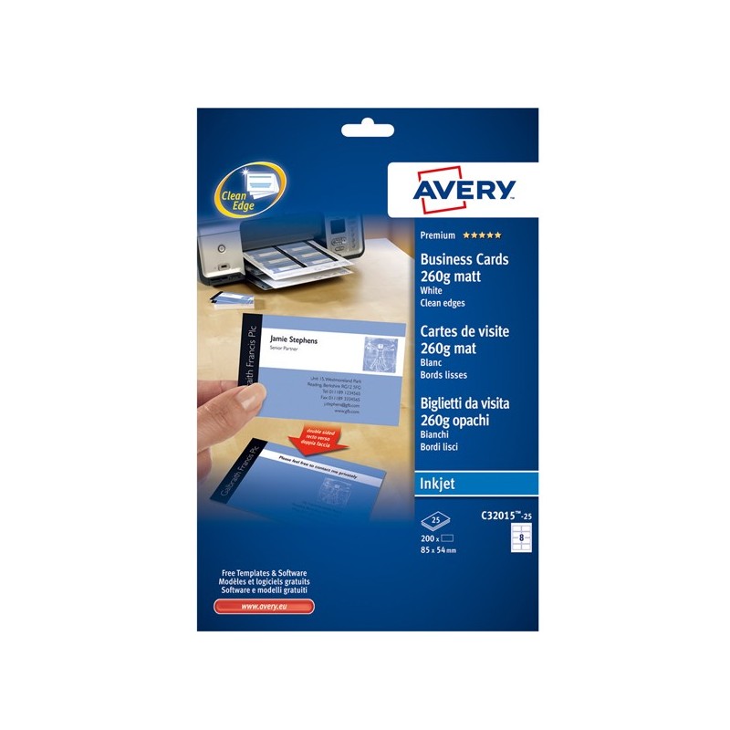 Biglietti da visita - 85 x 54 mm - 260 gr - effetto opaco - bianco - Avery - conf. 25 fogli da 8 biglietti