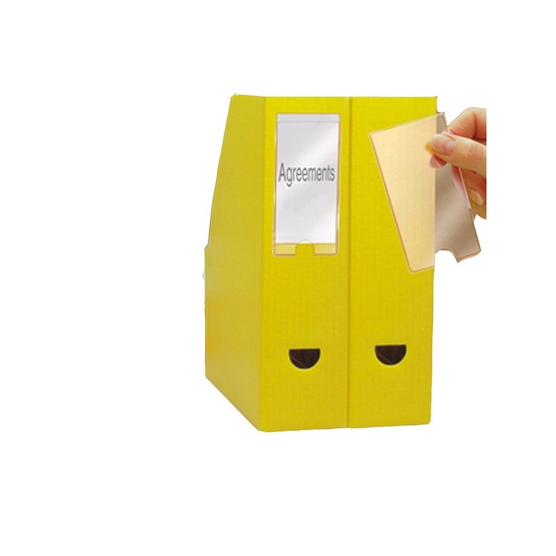 Portaetichette in polipropilene autoadesivi, permanenti e trasparenti, dotati di etichette di carta scrivibili, stampabili e intercambiabili. Comoda apertura a semicerchio che permette di inserire e rimuovere agevolmente gli inserti. Ideali per contrassegnare in modo semplice e rapido raccoglitori, registratori, archivi, ecc... Formato 25x75 mm.