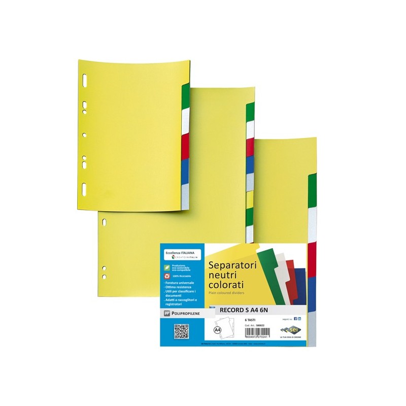 Separatori neutri colorati realizzati in Polipropilene. Dotati di 6 tasti scrivibili per una comoda classificazione dei documenti. Foratura universale. Formato contenuto: 21x29,7 cm (A4).