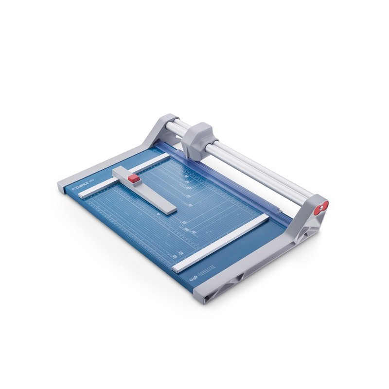 Taglierina a rullo professionale con pressino automatico trasparente - squadra laterale - piano quadrettato con linee in formato DIN e suddivisione in cm -lama circolare rotante molata - lama inferiore molata. Marginatore posteriore regolabile. Luce di taglio 360 mm, spessore di taglio 2,0 mm, dimensione del piano 555x360 mm.
