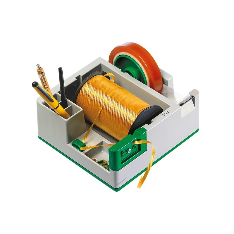 Portatutto da banco. Completo da dispenser per nastro adesivo da 33/66mt e spazio riservato ai nastri regalo.Base antiscivolo.