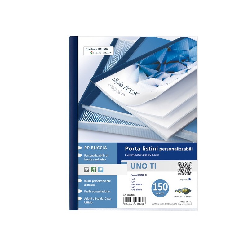 Porta listini a 150 buste in PP buccia arancia, con copertina e retro personalizzabili. Dorso blu. Il perfetto allineamento delle buste e la particolare saldatura facilitano la consultazione. Formato contenuto 220x300mm.