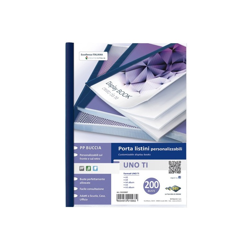 Porta listini a 200 buste in PP buccia arancia, con copertina e retro personalizzabili. Dorso blu. Il perfetto allineamento delle buste e la particolare saldatura facilitano la consultazione. Formato contenuto 220x300mm.