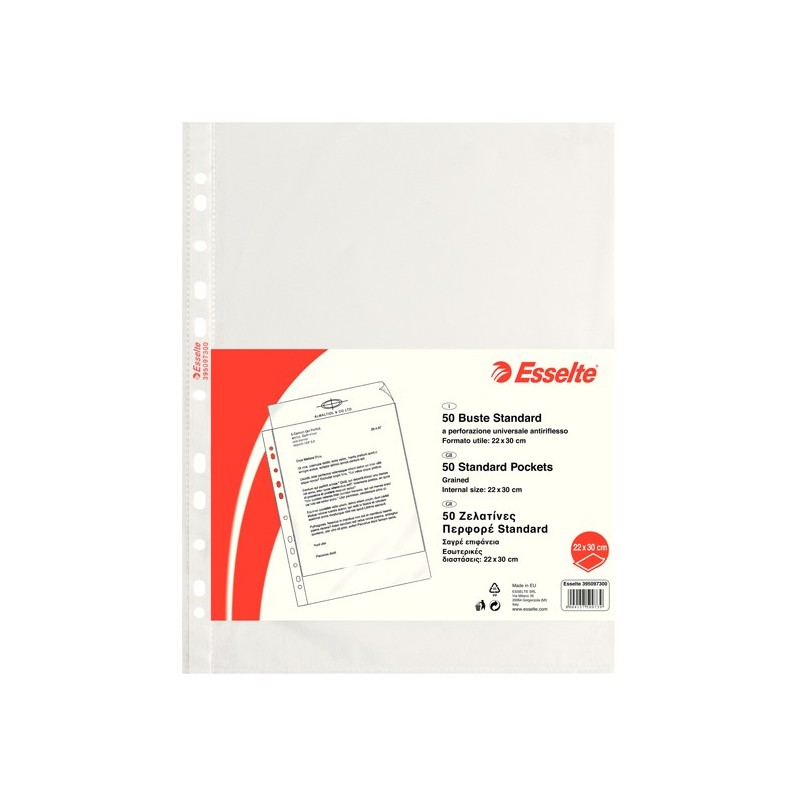 Buste forate realizzate in polipropilene trasparente ad elevata resistenza con foratura universale. Formato 22x30cm - buccia. Confezione da 50 buste.