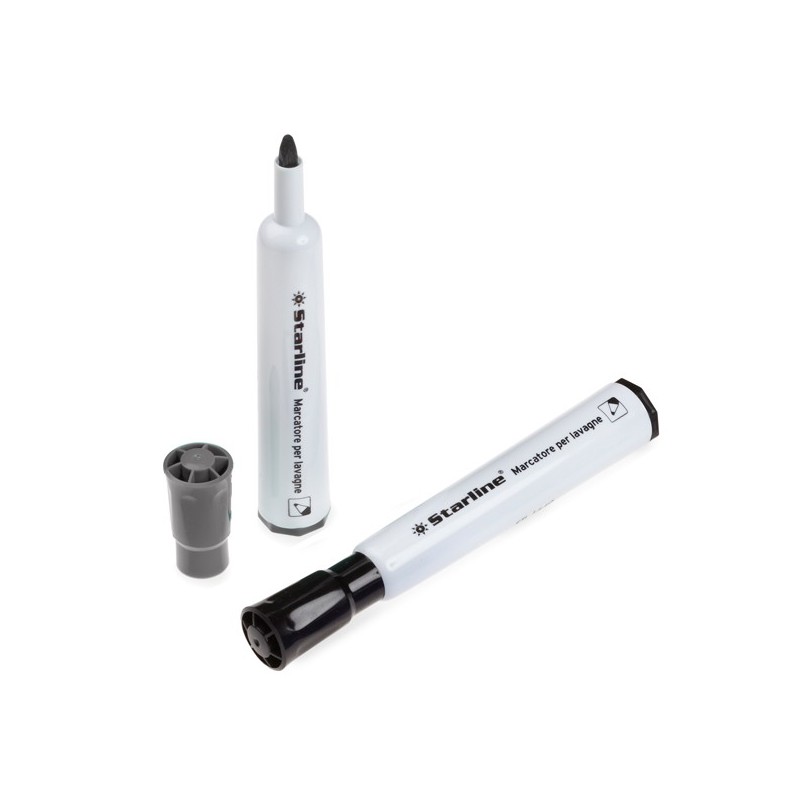 Marcatore STARLINE per lavagne bianche cancellabili. Inchiostro cancellabile a secco. Fusto bianco e cappuccio nel colore dell'inchiostro. Punta tonda da 2mm. Colore: nero.