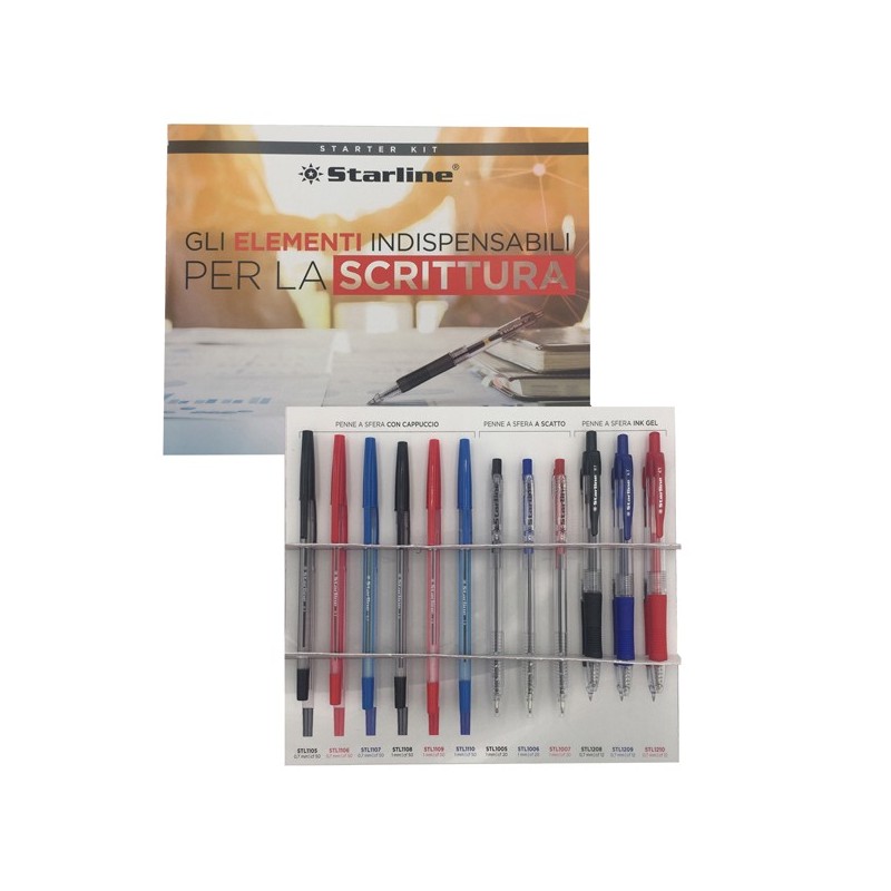 Starter kit di scrittura Starline! Fai provare ai tuoi clienti la qualità di scrittura delle sfere Starline con questo piccolo campionario di 12 penne assortite nei 3 colori principali. Il kit comprende: