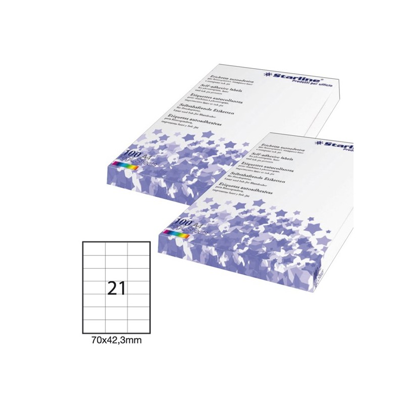 Etichette adesive bianche STARLINE utilizzabili con stampanti laser, inkjet o fotocopiatori. Adesivo permanente. Prive di margne di sicurezza lungo il perimetro. In scatola da 100 fogli formato A4.