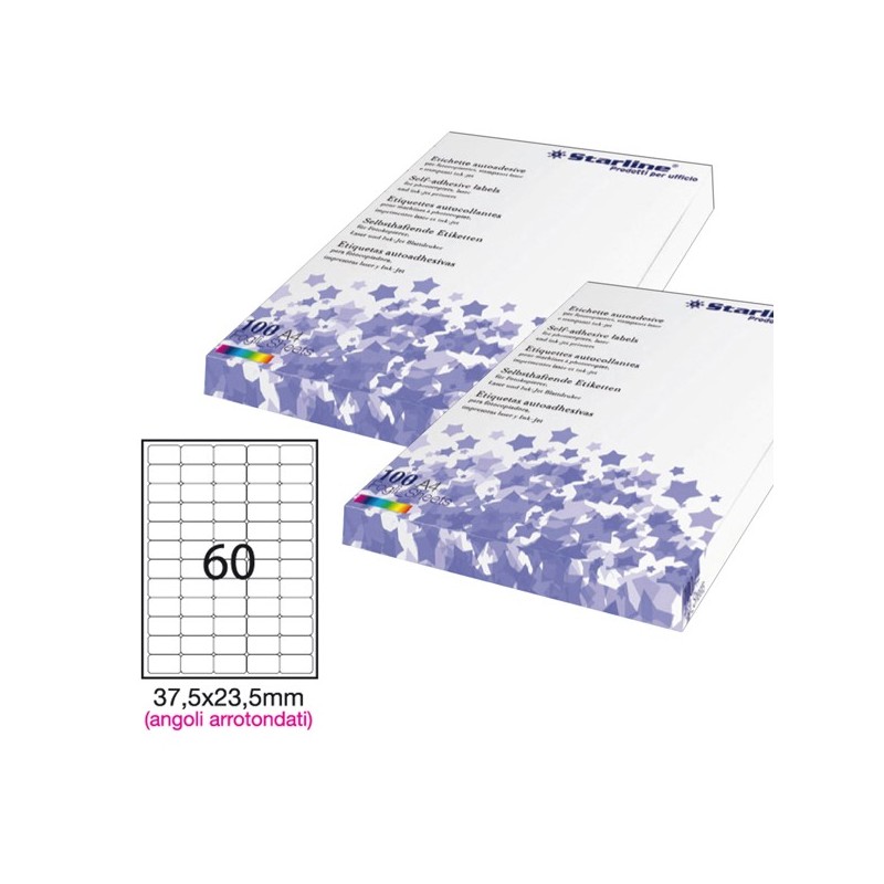 Etichette adesive bianche STARLINE utilizzabili con stampanti laser, inkjet o fotocopiatori. Adesivo permanente. Dotate di margine di sicurezza lungo tutto il perimetro. In scatola da 100 fogli formato A4.