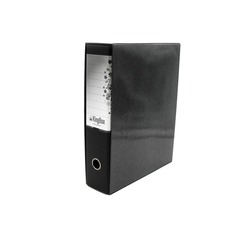 KingBox è un registratore indeformabile, lavabile e duraturo nel tempo, in cartone accoppiato da 2 mm di spessore, con rivestimento in resistente polipropilene goffrato. Dotato di propria custodia in cartone accoppiato nero, con bordi rinforzati, e di meccanismo a leva di alta qualità ancorato saldamente mediante 4 rivetti. Per agevolare la presa e facilitare l'archiviazione, KingBox presenta un anello di estrazione in acciaio nichelato (diametro 25 mm) ed una etichetta personalizzabile/scrivibile all'interno di una comoda busta termosaldata in PVC trasparente (170x100 mm), interamente fasciante il dorso.