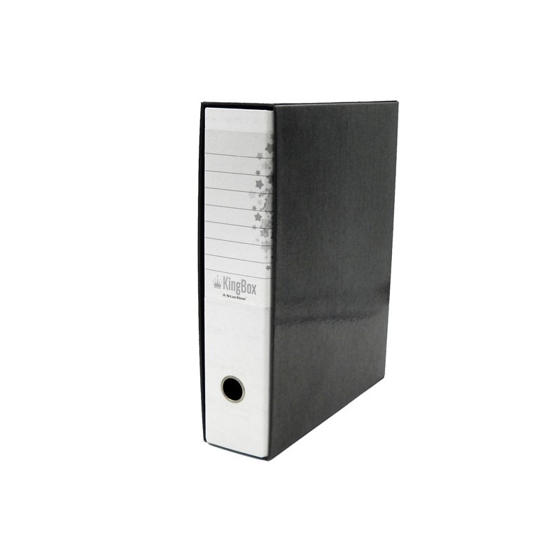 KingBox è un registratore indeformabile, lavabile e duraturo nel tempo, in cartone accoppiato da 2 mm di spessore, con rivestimento in resistente polipropilene goffrato. Dotato di propria custodia in cartone accoppiato nero, con bordi rinforzati, e di meccanismo a leva di alta qualità ancorato saldamente mediante 4 rivetti. Per agevolare la presa e facilitare l'archiviazione, KingBox presenta un anello di estrazione in acciaio nichelato (diametro 25 mm) ed una etichetta personalizzabile/scrivibile all'interno di una comoda busta termosaldata in PVC trasparente (170x100 mm), interamente fasciante il dorso.