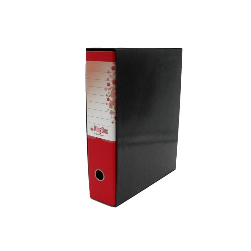KingBox è un registratore indeformabile, lavabile e duraturo nel tempo, in cartone accoppiato da 2 mm di spessore, con rivestimento in resistente polipropilene goffrato. Dotato di propria custodia in cartone accoppiato nero, con bordi rinforzati, e di meccanismo a leva di alta qualità ancorato saldamente mediante 4 rivetti. Per agevolare la presa e facilitare l'archiviazione, KingBox presenta un anello di estrazione in acciaio nichelato (diametro 25 mm) ed una etichetta personalizzabile/scrivibile all'interno di una comoda busta termosaldata in PVC trasparente (170x100 mm), interamente fasciante il dorso.