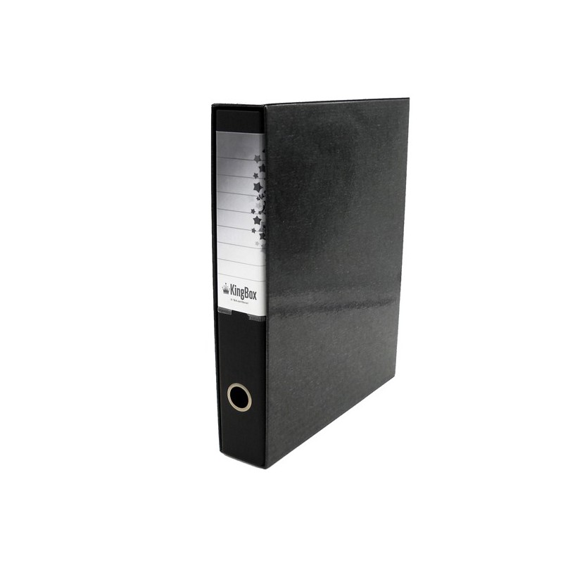 KingBox è un registratore indeformabile, lavabile e duraturo nel tempo, in cartone accoppiato da 2 mm di spessore, con rivestimento in resistente polipropilene goffrato. Dotato di propria custodia in cartone accoppiato nero, con bordi rinforzati, e di meccanismo a leva di alta qualità ancorato saldamente mediante 4 rivetti. Per agevolare la presa e facilitare l'archiviazione, KingBox presenta un anello di estrazione in acciaio nichelato (diametro 25 mm) ed una etichetta personalizzabile/scrivibile all'interno di una comoda busta termosaldata in PVC trasparente (170x100 mm), interamente fasciante il dorso. Il registratore KingBox è disponibile in 2 modelli formato protocollo (dorso 5 e dorso 8) e in un'ampia gamma di colori. Caratteristiche di questo articolo: • Codice: STL4026 • Modello: KingBox Protocollo dorso 5 • Colore: nero • Formato utile: (LxH 23x33cm) • Dorso: 5cm • Custodia: compresa • Portaetichetta con cartoncino: compreso • Meccanismo: a leva con pressino • Dimensioni esterne: 285x355x55mm • Confezione: 1pz