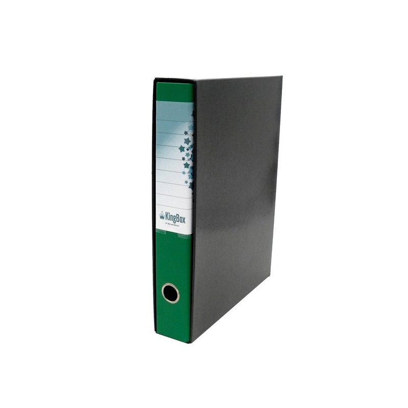 KingBox è un registratore indeformabile, lavabile e duraturo nel tempo, in cartone accoppiato da 2 mm di spessore, con rivestimento in resistente polipropilene goffrato. Dotato di propria custodia in cartone accoppiato nero, con bordi rinforzati, e di meccanismo a leva di alta qualità ancorato saldamente mediante 4 rivetti. Per agevolare la presa e facilitare l'archiviazione, KingBox presenta un anello di estrazione in acciaio nichelato (diametro 25 mm) ed una etichetta personalizzabile/scrivibile all'interno di una comoda busta termosaldata in PVC trasparente (170x100 mm), interamente fasciante il dorso.