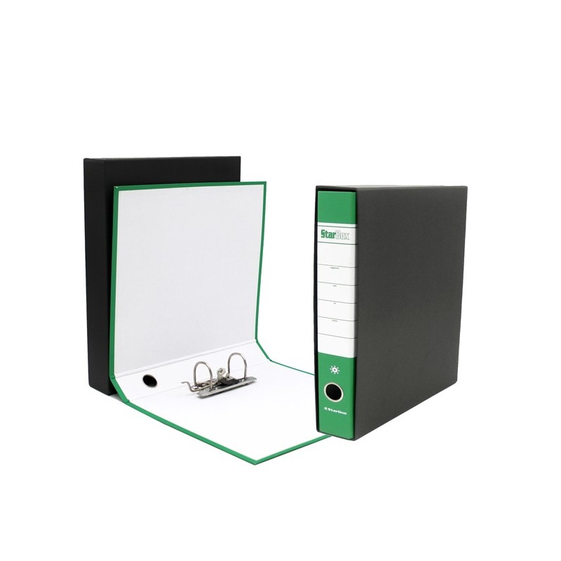 Registratore STARLINE modello StarBox, con struttura in cartone rivestita in carta goffrata stampata e risguardo bianco. Dotato di meccanismo a leva in acciaio nichelato con pressino. Custodia in fibrone nero rivestita in carta usomano. Anello di estrazione in metallo.