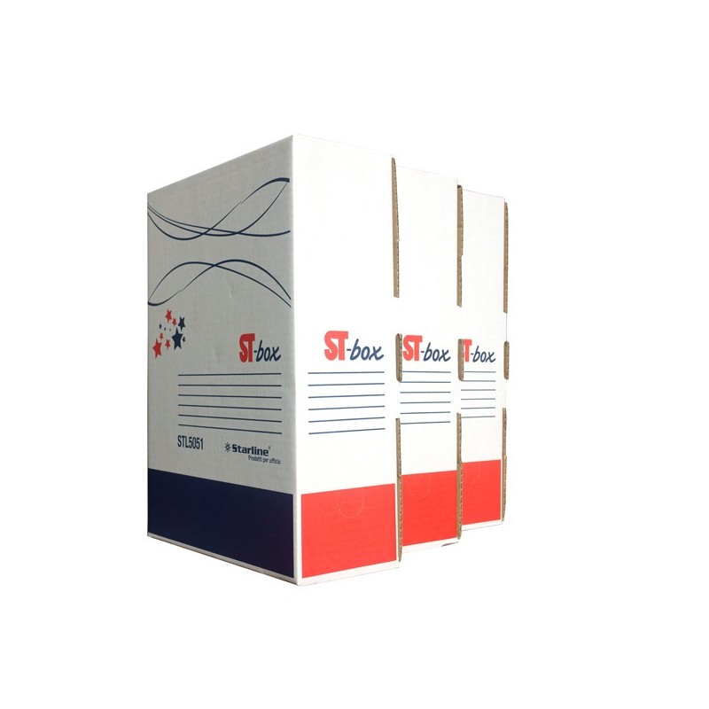Scatole STARLINE archiviabili in 3 posizioni (lato corto, lato lungo verticale e lato lungo orizzontale) ognuna dotata di foro di estrazione. Disponibile nel formato legale. Caratteristiche di questo prodotto: • Codice: STL5052 • Tipo prodotto: Scatola archivio • Chiusura: lembo ribaltabile • Colore: bianco/blu • Formato (LxHxP) 37,5x26,5x9,5cm • Formato utile: 35,5x26x9cm • Materiale: cartone riciclato • Confezione: 25pz MADE IN ITALY
