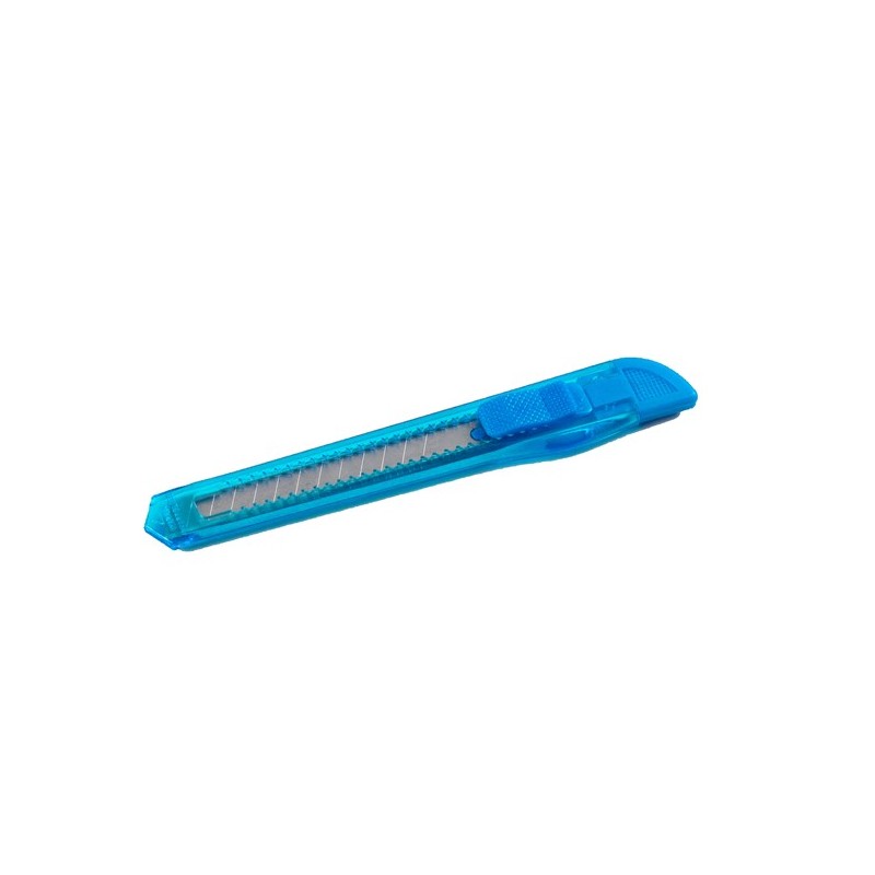 Cutter con impugnatura in ABS e bloccalama a scatto. Larghezza lama: 9 mm. Lunghezza: 8 cm. Confezionato in bustina trasparente appendibile.