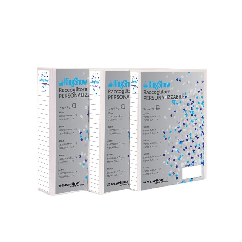Raccoglitore STARLINE rivestito in polipropilene finitura goffrata, con tasca trasparente interna per appunti e meccanismo a 4 anelli (a D). Personalizzabile sul fronte e sul dorso. Contiene documenti formato A4.