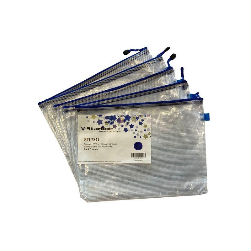 Busta STARLINE in robusto PVC a rete con cerniera di colore blu. Ideale per documenti e piccoli oggetti.