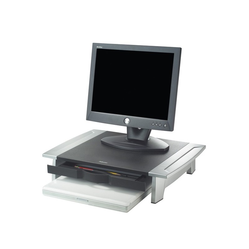 Supporto monitor realizzato in plastica antiurto con altezza regolabile fino 15 cm. Può sostenere monitor e schermi TFT fino ad un peso massimo di 36 Kg. Fornito di vaschetta sottostante per archiviare pratiche e documenti. Dimensioni 36,4 x 50 x 10 cm. Peso 2,26kg.