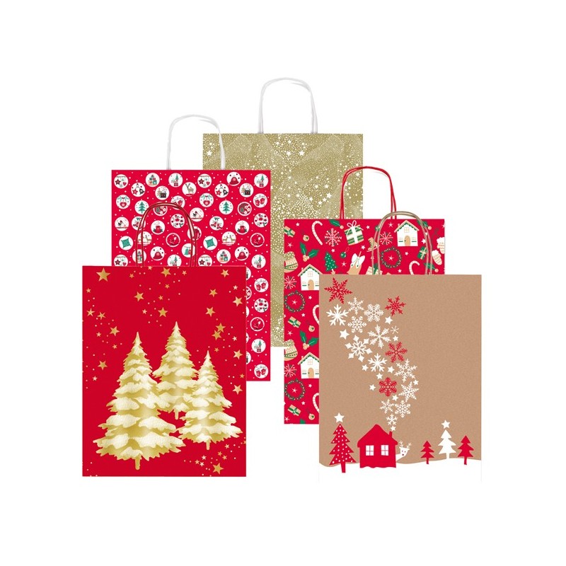 Shopper regalo realizzato in carta kraft bianco con stampe a colori. Dotato di manici in carta ritorta. Assortimento di 5 differente fantasie natalizie.