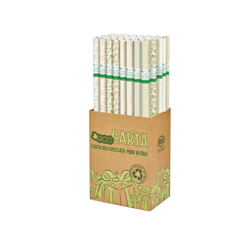 Carta regalo in rotolo da 70cmx2mt. Carta kraft bianca erba riciclata al 100% 70g/m2. Ottenuta da fibre di erba essicata, leggera profumazione d'erba. Fantasie assortite.