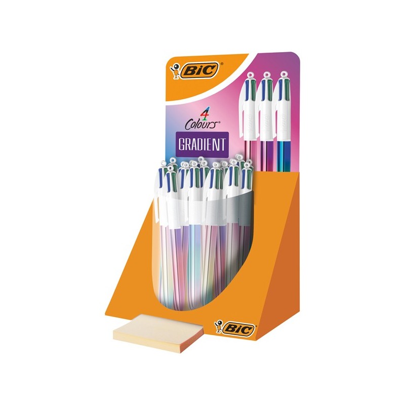 Espositore da banco con 30 penne 4 colori in una particolare versione dal fusto metallizzato con 3 diverse luminose sfumature tricolori sui fusti nella stessa penna.
