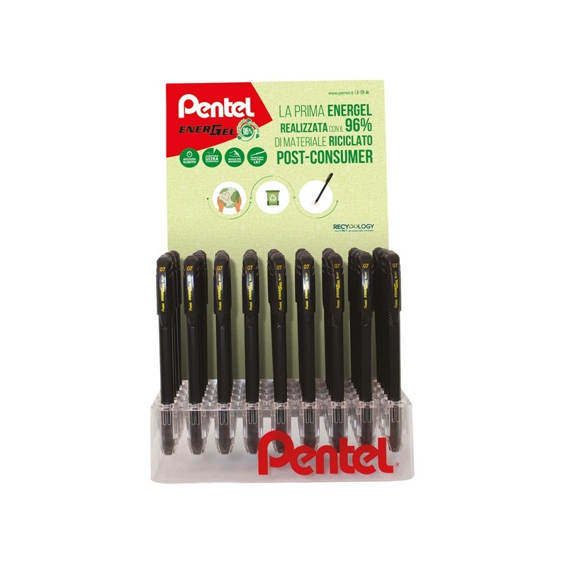 Espositore da banco con 48 roller con cappuccio realizzati in materiale riciclato al 96%. Assortimento di 3 colori (nero 24pz/rosso 12pz/blu 12pz). Punta 0,7mm.