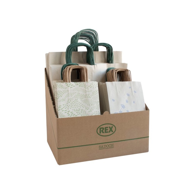 Espositore da banco con 100 shopper assortiti in 3 fantasie e 3 formati differenti. (21x16x8cm/36x26x12cm/41x36x12cm). Realizzati in carta erba dotati di manici ritorti.