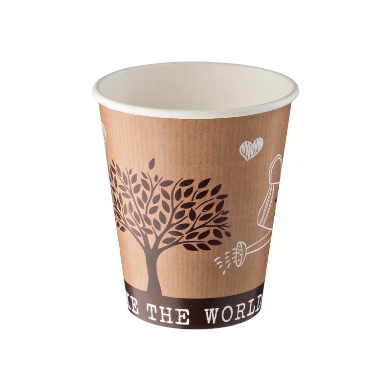 Bicchieri realizzati in poliaccoppiato Carta e PE (superiore al 5%) per cui smaltito nell'indifferenziata (secco). Prodotto idoneo al contatto con bevande calde e fredde. Il prodotto non può essere utilizzato unitamente all'alimento nel forno tradizionale e forno a microonde. • Bicchiere: Ø cm.8x9h; 240ml. • Peso unitario 7.5gr • Colore: marrone + bianco