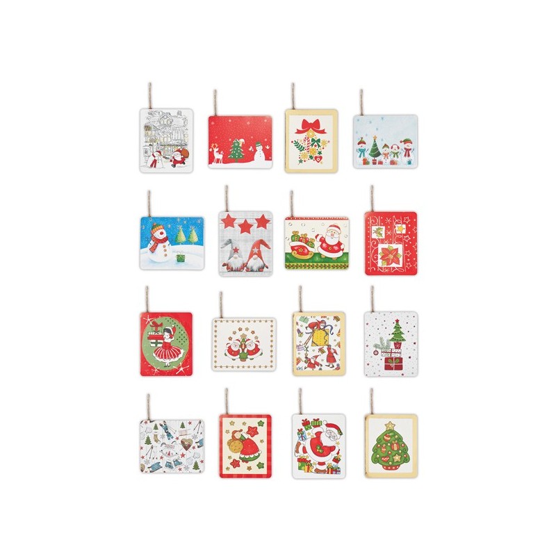 Segnapacco natalizio con cordoncino in oro infilato. Realizzato in cartoncino con stampa offset e stampa oro a caldo. Fantasie assortite.