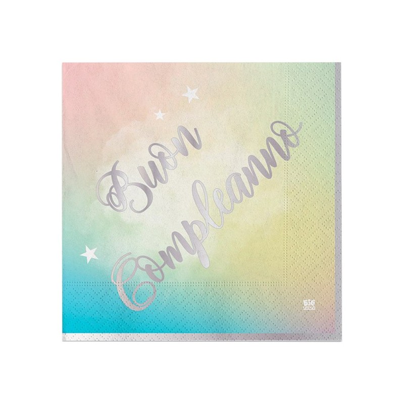 Tovaglioli in carta con scritta Buon Compleanno Soft Rainbow. Dimensioni: 33x33cm