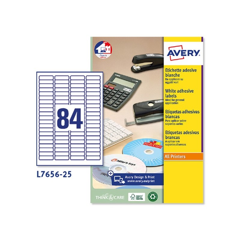 Scatola da 25 fogli di etichette in carta adesiva. Ogni foglio contiene 84 mini etichette con angoli tondi nel formato 46x11,11mm. Per stampanti Inkjet e Laser.