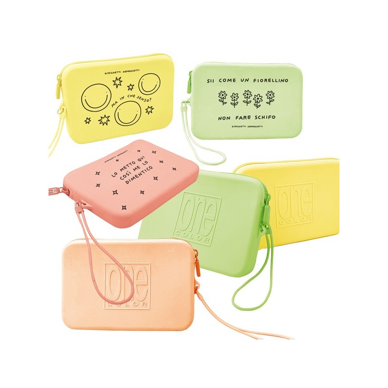 Astuccio Disegnetti Depressetti pochette o miniborsa . Realizzato in silicone soft touch dotato di zip e laccio removibile in tinta. Dimensioni: 19x12x2cm. 3 colori assortiti.