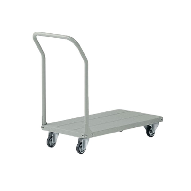 Carrello verniciato a polvere in lamiera, con pianale in lamiera rinforzata spessore 15/10 e manici smontabili. Colore grigio RAL 7038. Ruote 8cm con boccola, 2 fisse e 2 girevoli. Dimensioni carrello: 90,5Lx45Px14/81Hcm. Dimensioni pianale: 80Lx45cm. Portata 150kg. Fornito smontato.
