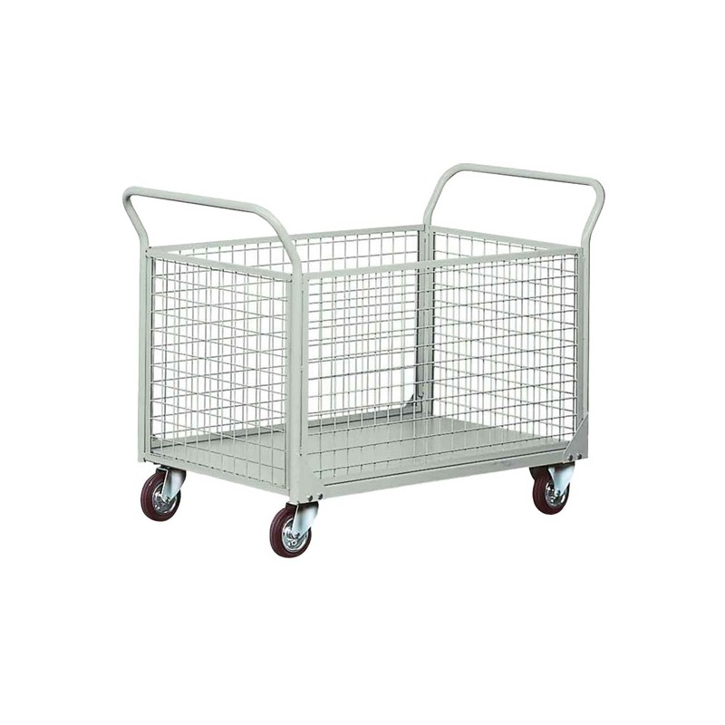 Carrello con pianale in lamiera e 4 sponde, di cui 2 laterali asportabili, in tubo e rete con maglia 5x5x0,4cm. Ruote 14cm con cuscinetti a rulli, 2 fisse e 2 girevoli. Portata 300kg. Verniciatura a polvere grigio RAL 7038. Dimensioni carrello: 138Lx66Px20/96Hcm. Dimensioni pianale: 110Lx65Pcm. Fornito smontato.