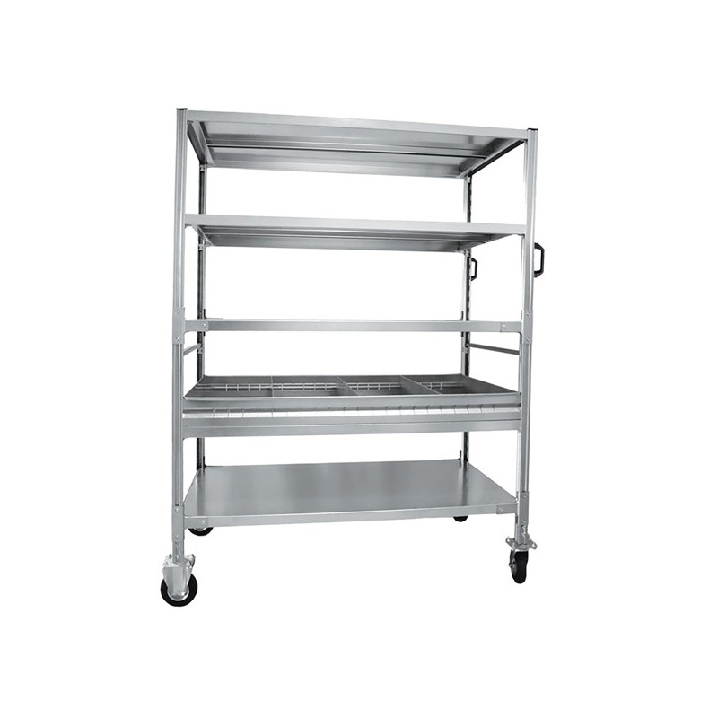 Carrello zincato con struttura in profilato, 4 piani e 1 vaschetta con 3 divisori centrali regolabili con 1 rinforzo e ganci, fasce di stabilità, 2 maniglie e ruote diametro12,5cm con cuscinetti a rulli, 2 fisse e 2 girevoli di cui 1 frenante. Portata 300 kg. Dimensioni: mm. 131Lx67Px165,5Hcm. Fornito smontato.