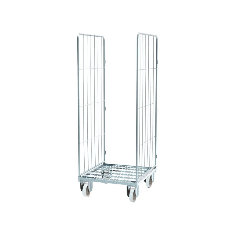 Carrello Roll Container con 2 sponde laterali con cinghia, in filo zincato, 4 ruote nylon 10cm, 2 fisse e 2 girevoli. Portata 500kg. Dimensioni: 70Lx80Px179Hcm. Fornito smontato.