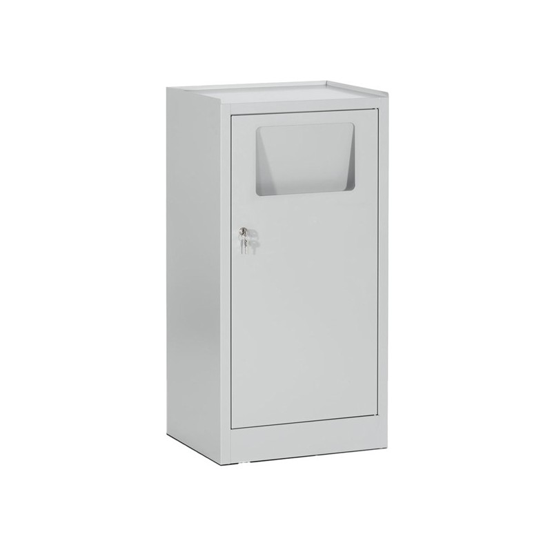 Armadietto portabiancheria in lamiera di acciaio pressopiegata a freddo spessore mm. 7/10. Colore grigio RAL7038. Il mobile è idoneo per lo smaltimento e il recupero di indumenti, panni e biancheria in genere. Vano interno dotato di 4 ganci in acciaio per il fissaggio del sacco di contenimento. Anta frontale con serratura a linguetta e frontalino basculante. Articolo completo di sacco interno di colore bianco in polipropilene naturale, con fondo chiuso, senza punti di sollevamento e munito di 4 anelli posizionati a 3cm dal bordo per il fissaggio ai ganci interni del mobile. Costruito a maglie resistenti, è lavabile. Dimensioni sacco 44 x 38 x 60cm. Dimensioni armadietto: 50x40x100cm. Fornito montato.